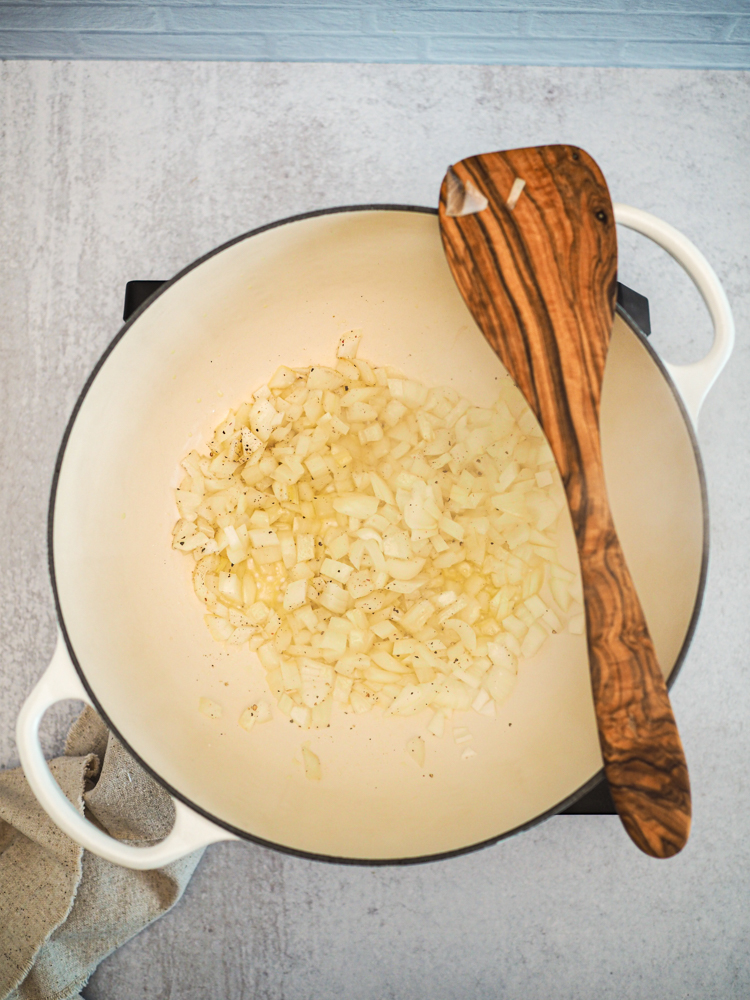 - Heat a bit of olive oil in a large pot over medium heat. Add the diced onion with a pinch of salt and pepper, cooking until translucent and starting to brown.