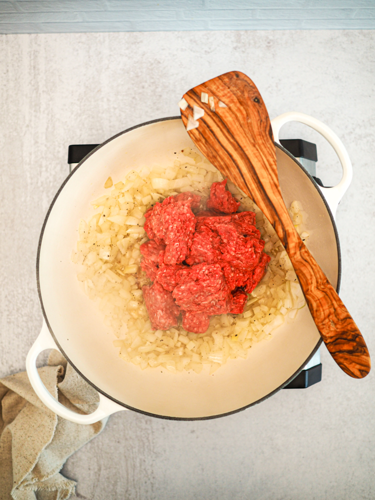 Push the onions aside, making a little nest or well in the bottom of your soup pot. Then add the ground beef and cook until browned, breaking it up and combining it with onions as it cooks.