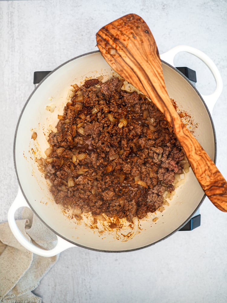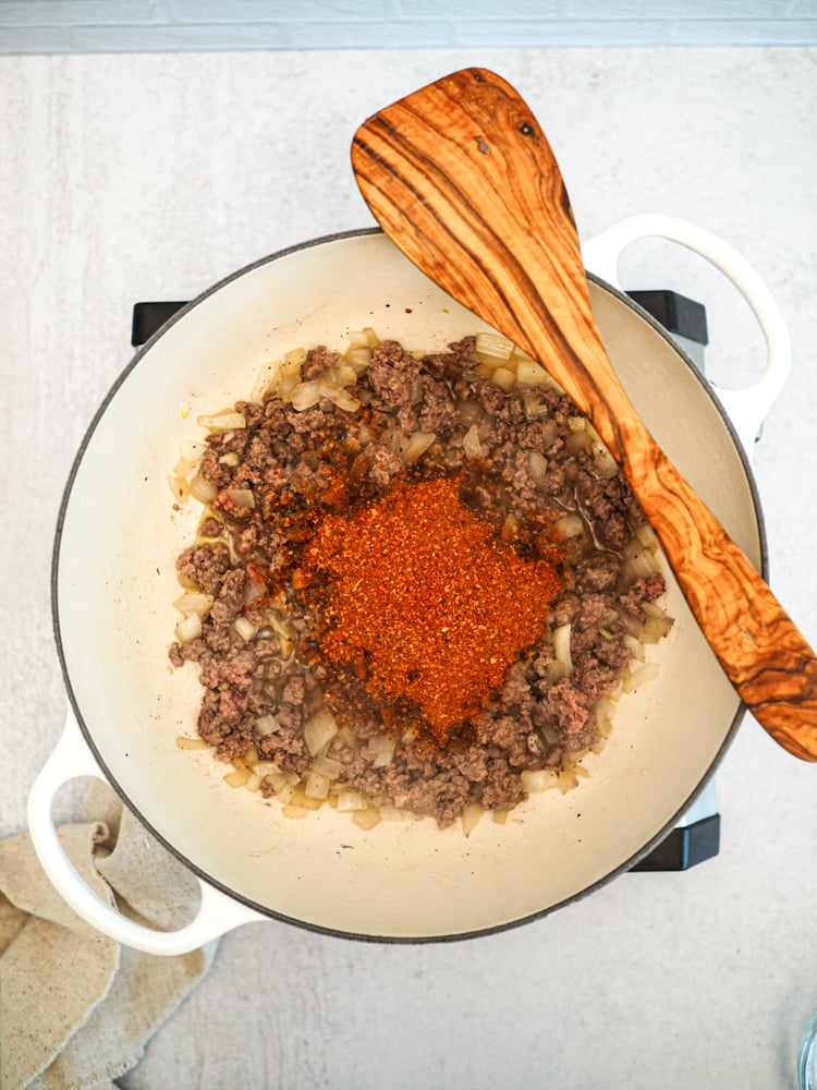 - Add the ground beef to the pot and cook until browned, breaking it up as it cooks.