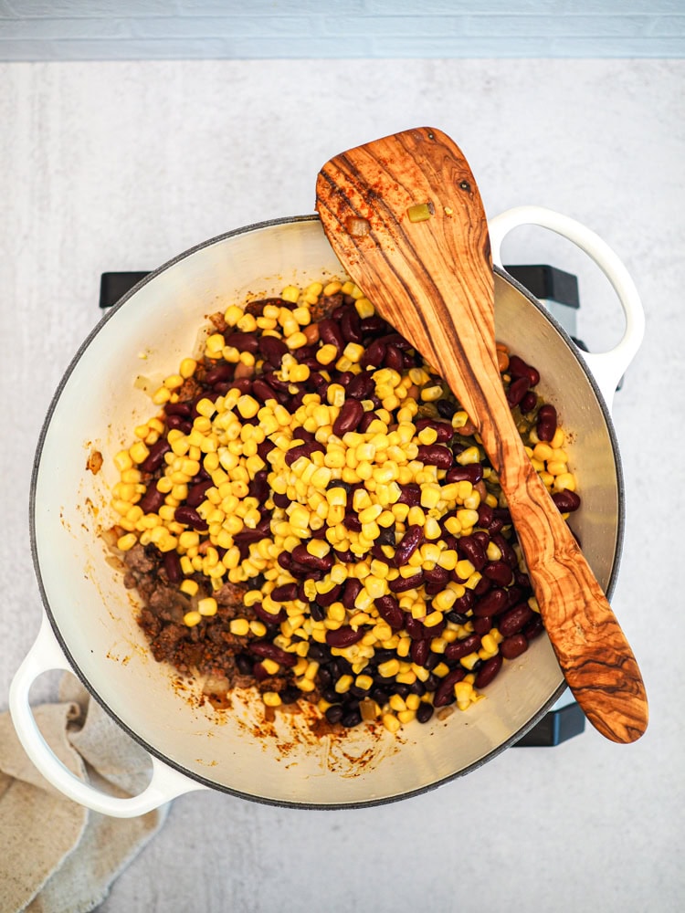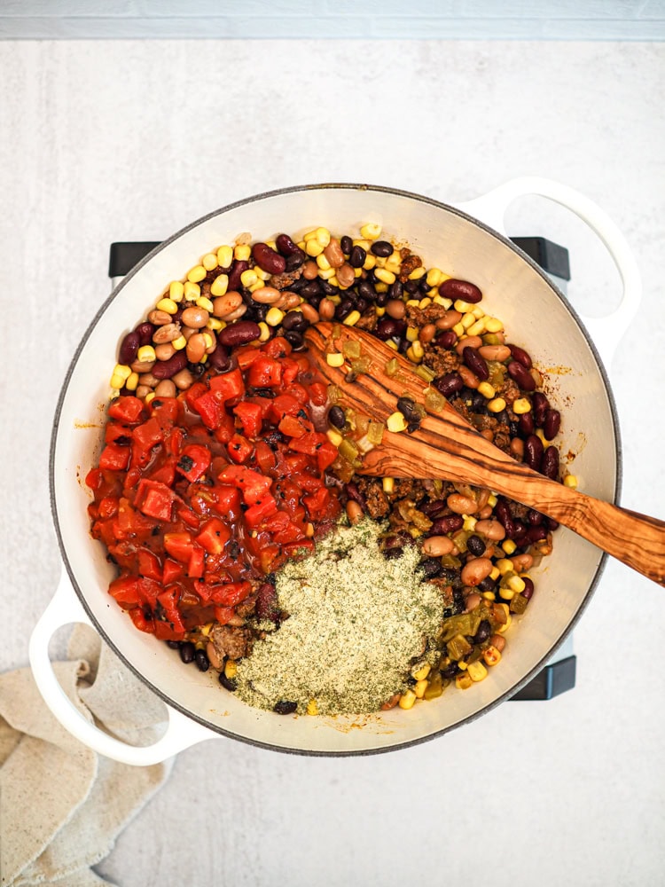 Next, add all the drained beans and corn and stir to combine. Then add the fire-roasted tomatoes with green chilis (don’t drain these) and the ranch seasoning, mixing everything together.
