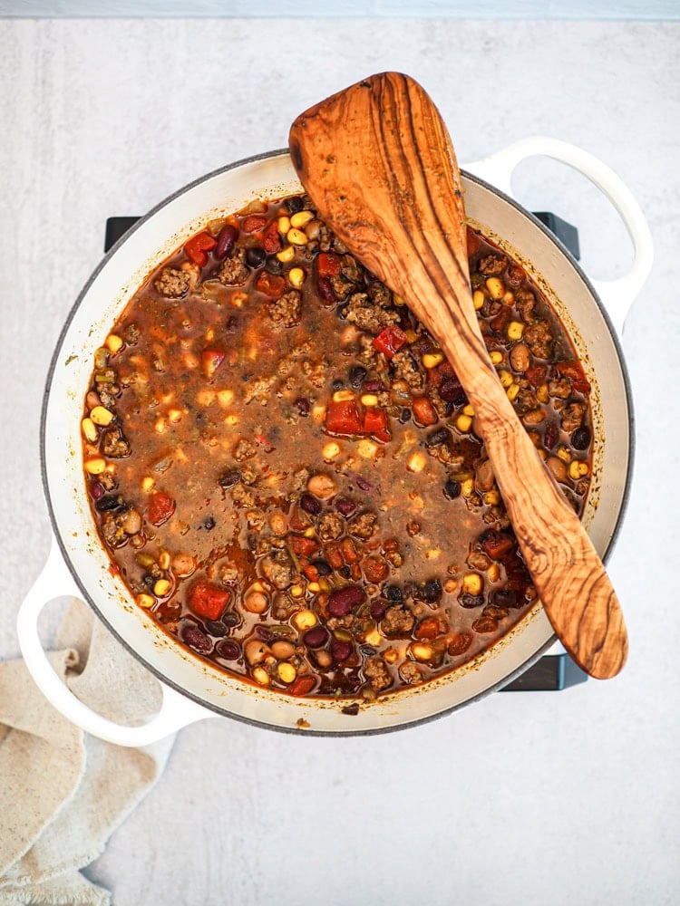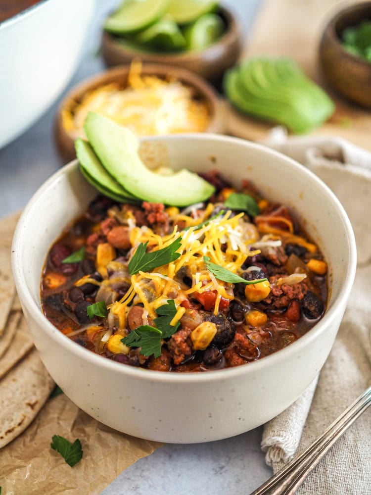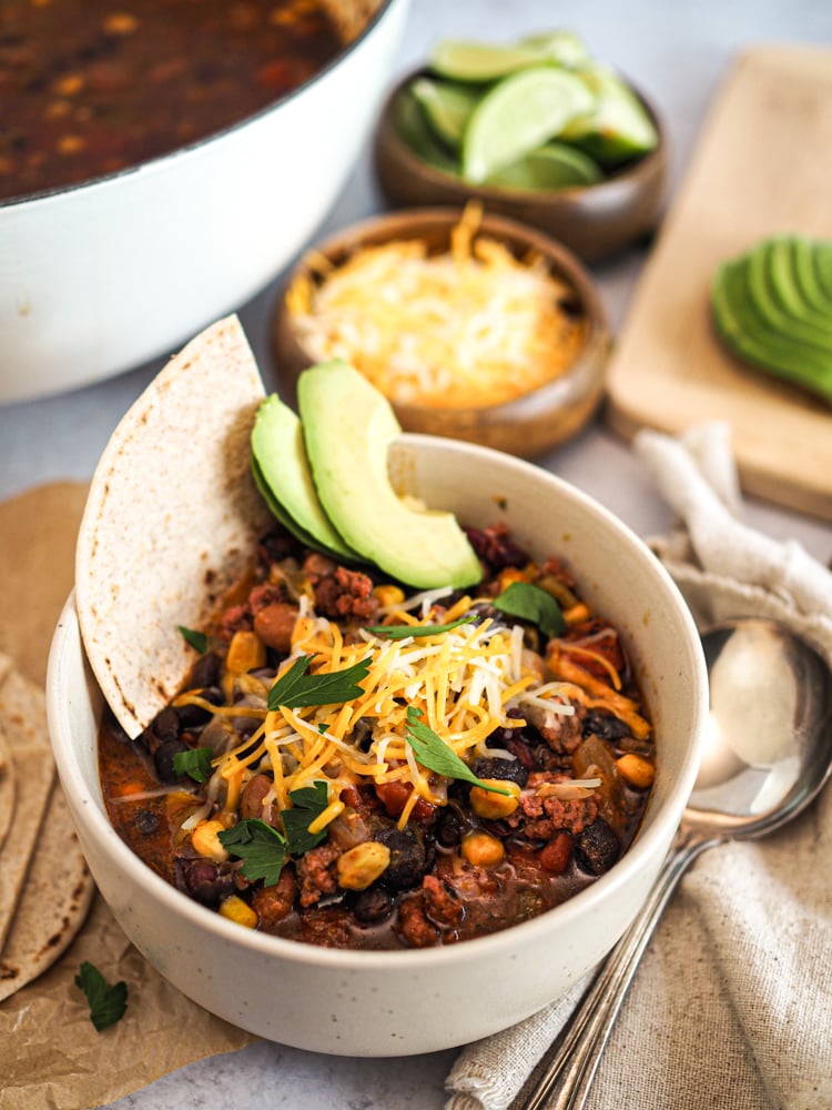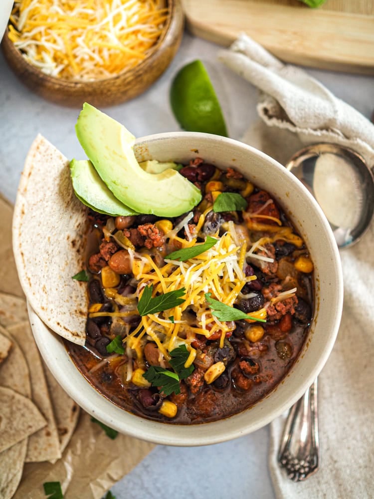 I like to add lots of toppings to tame the heat. Shredded cheddar cheese and sliced avocados are great! So are lime wedges as the acid in a little squeeze lime juice balances out the spice. You could also serve it with tortilla chips, cilantro, or any other toppings you’d like!