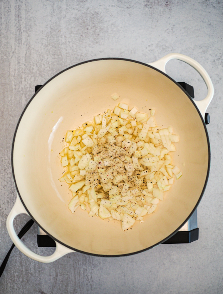Start by heating a bit of olive oil in a large pot over medium heat. Add the diced onion with a pinch of salt and pepper, cooking until the onions are translucent and starting to brown.